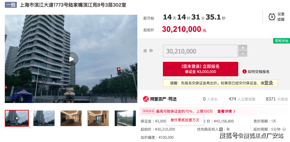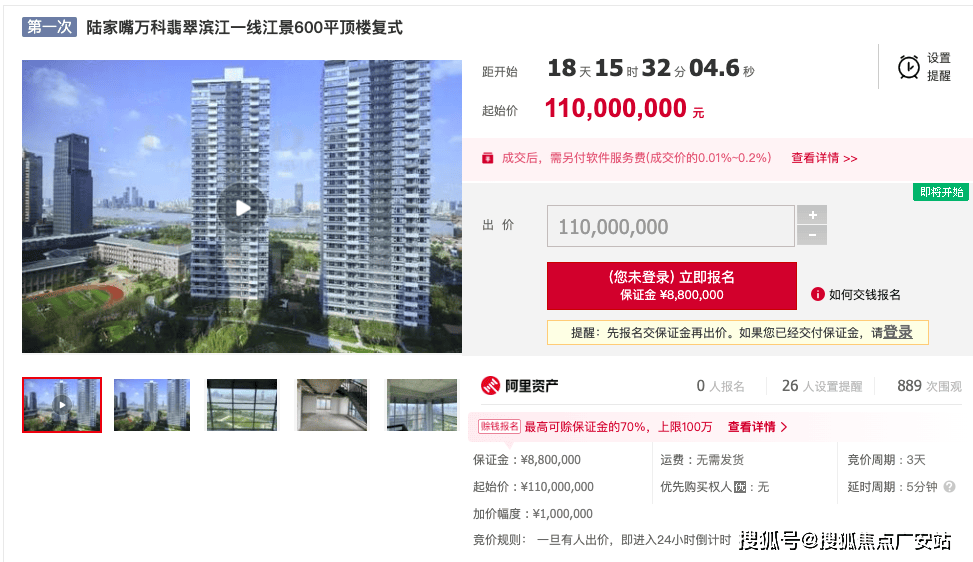 2022年10月,正在阿里拍卖网坐上,陆家嘴滨江挂牌了2套“高价房”,一套来自九庐,起拍价3021万元,折合约12。17万/㎡。
